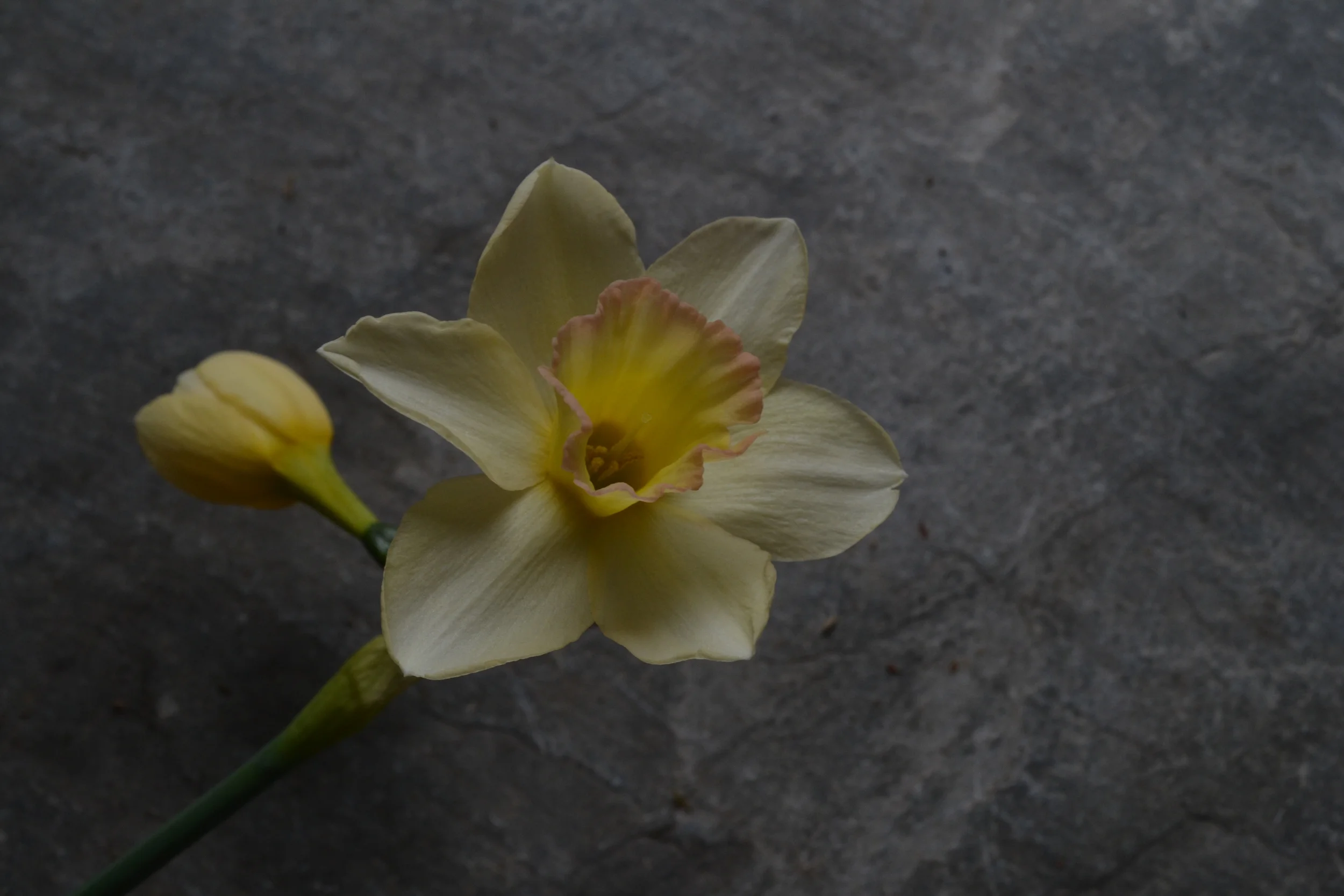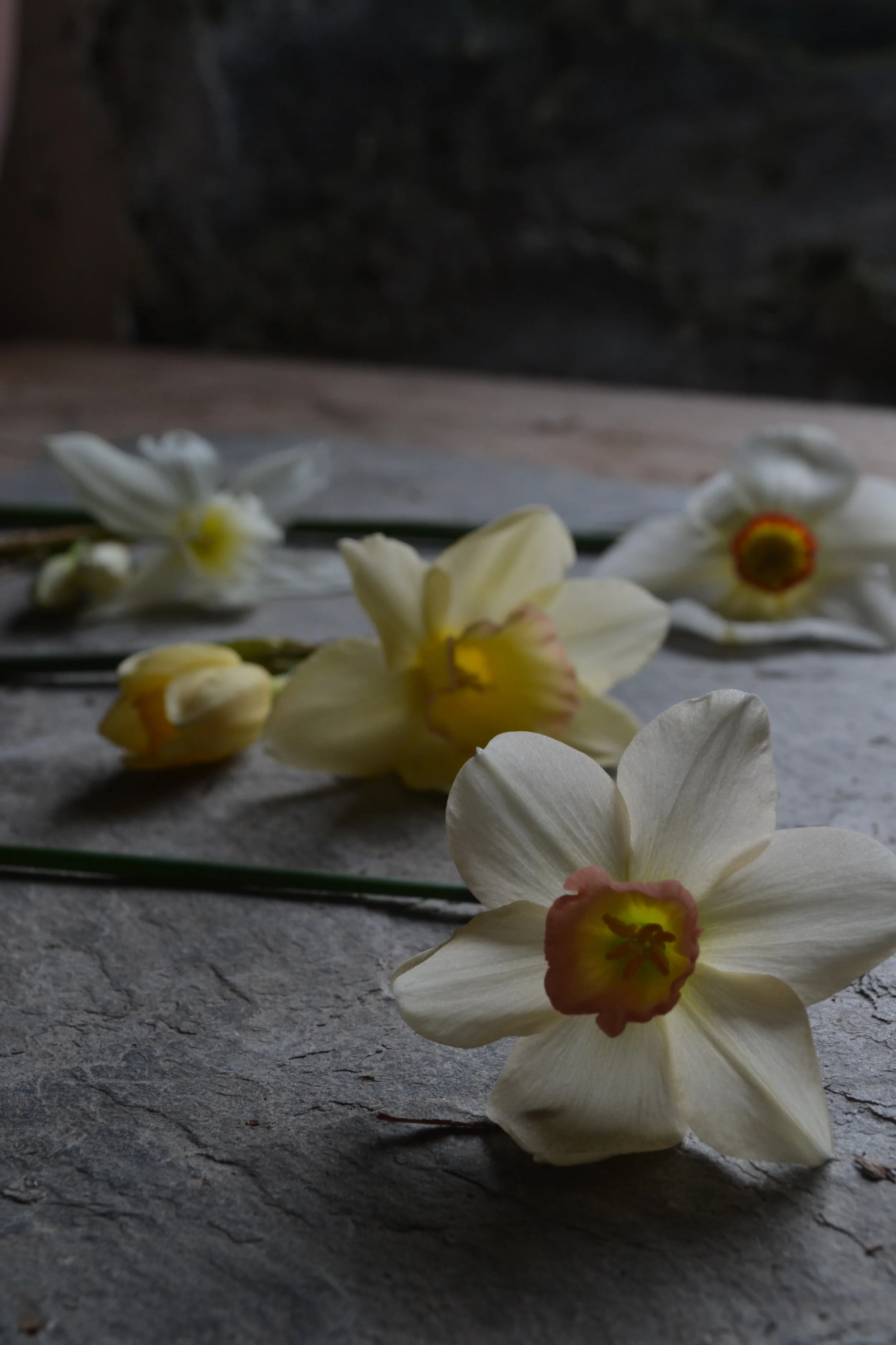 At last it feels like spring has arrived in our cutting garden with the welcome return of the narcissi. Maz makes a point of purchasing all the fancy looking bulbs and avoids the common yellows ones (sorry to all the common yellow lovers!). Seeking out the peachy tones and the elegant whites, these little flowers can really make a bouquet sing.