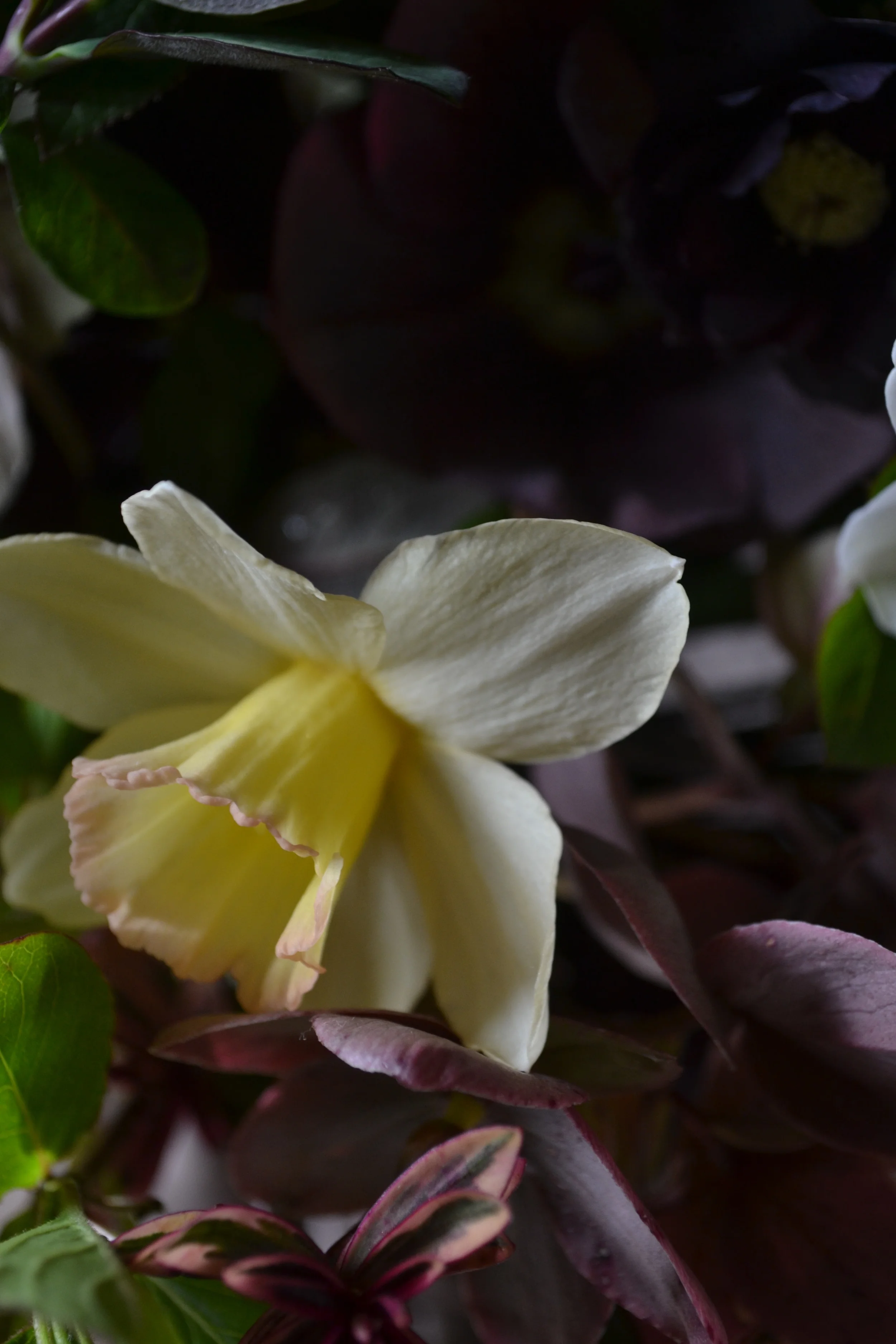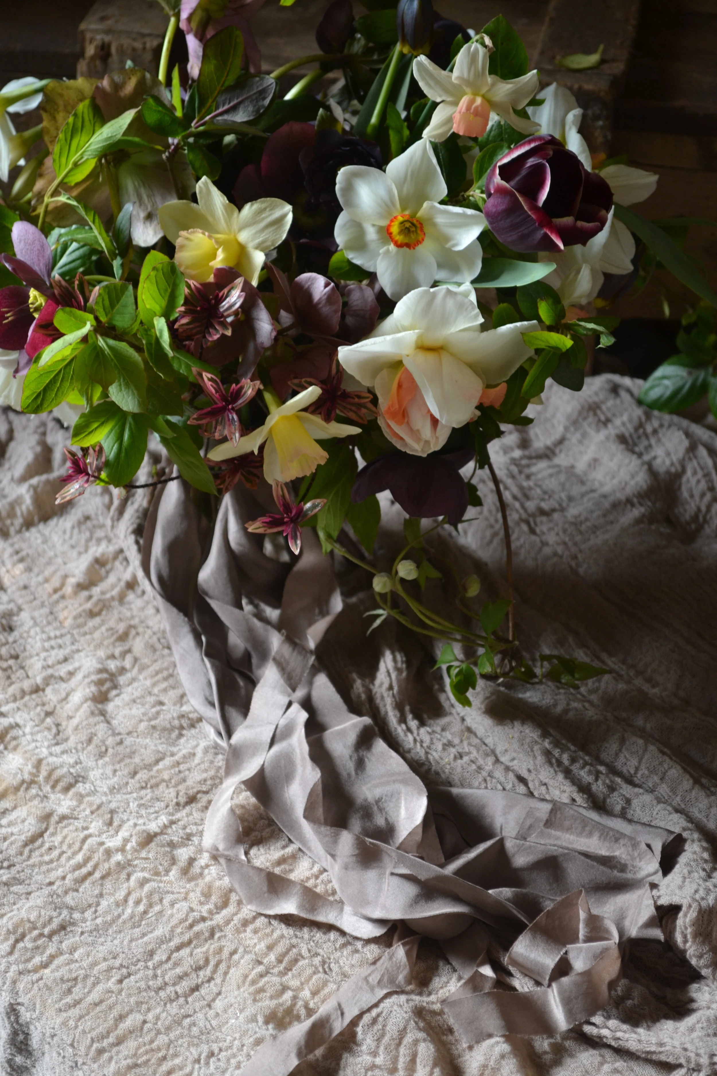 We have combined these pretty narcissi with some ripe hellebores and the only dark tulip in the tunnel that survived the rat attack....oh and a couple of fritillaries that survived the vole attack (did we tell you that growing flowers is one long vermin battle?!). This bouquet has a moody, yet spring-like feel fit for any bride with sophisticated taste!