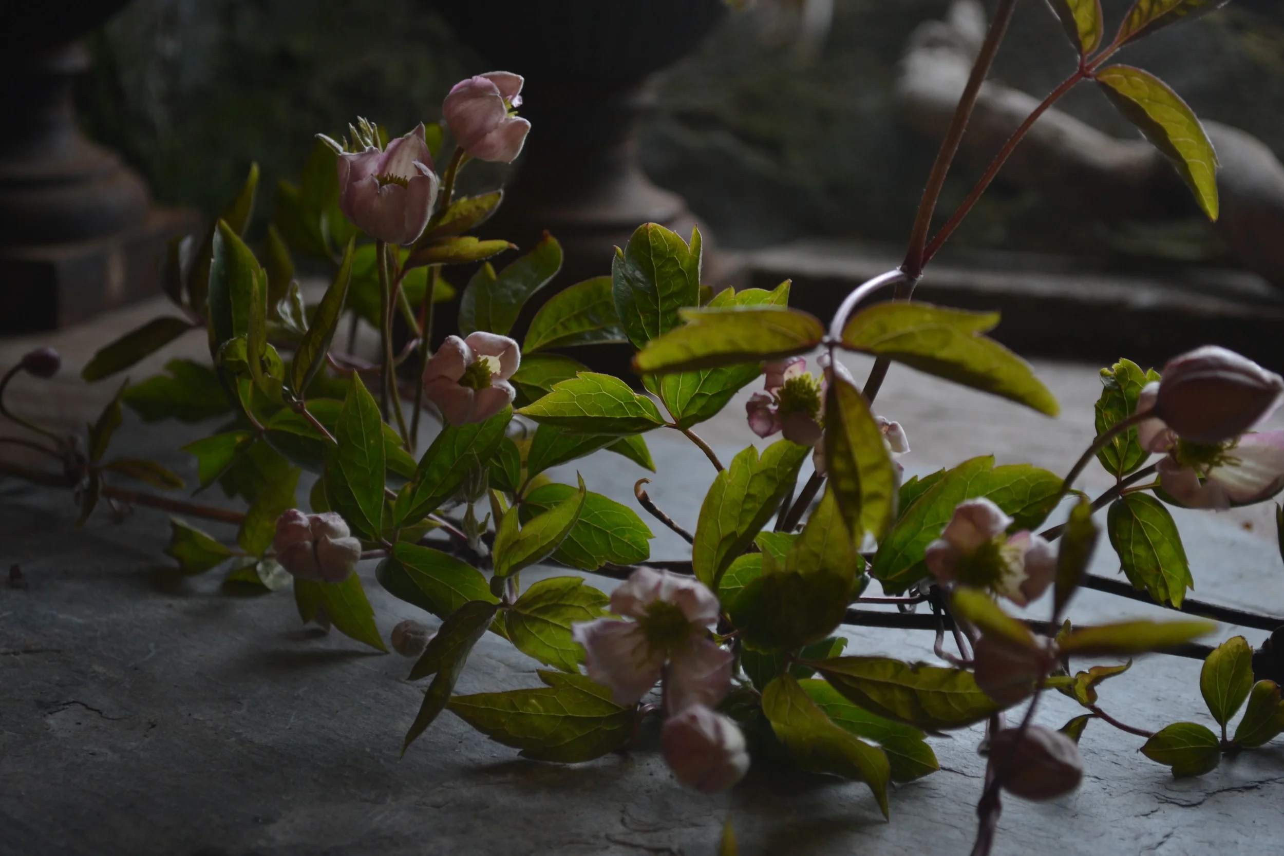 This time it was clematis Montana.  Covering a quarter of the farmhouse in deep purple tenderals it's starting to burst into life once again - I'll squealed as it caught my eye....whilst also remember not to bash the car going through the gates!  Flowering vines and branches have to be an all time Garden Gate favourite and can turn that bouquet into the wispy weaving arrangement we oh so love.  So, with snips in hand and my kids distracting mum (she doesn't really mind us cutting it - but I'd rather she didn't look!) I gather a couple of branches for an April bouquet.