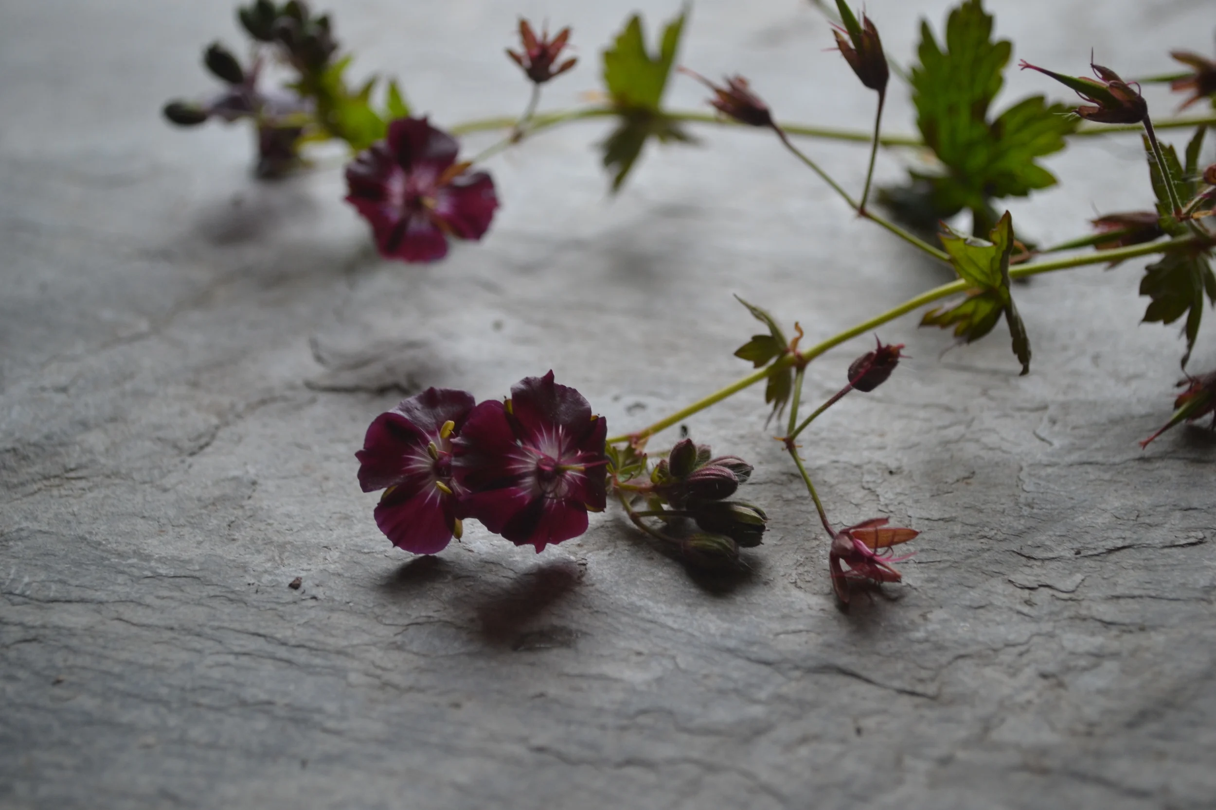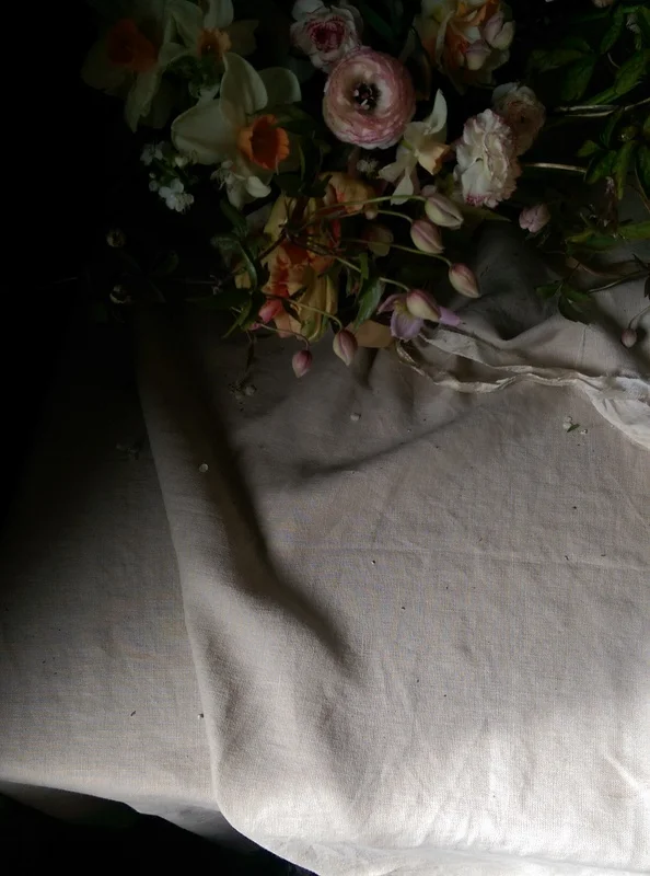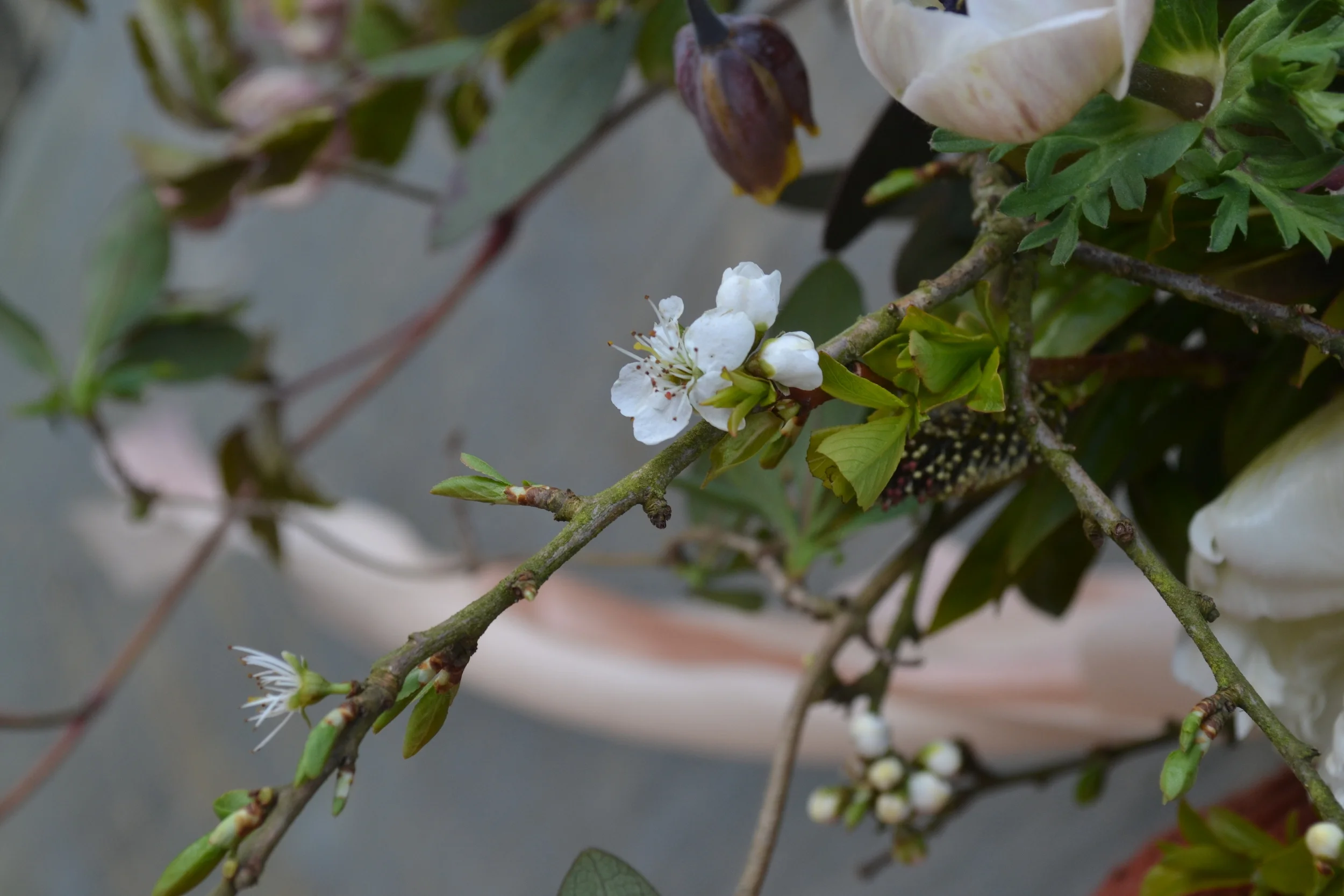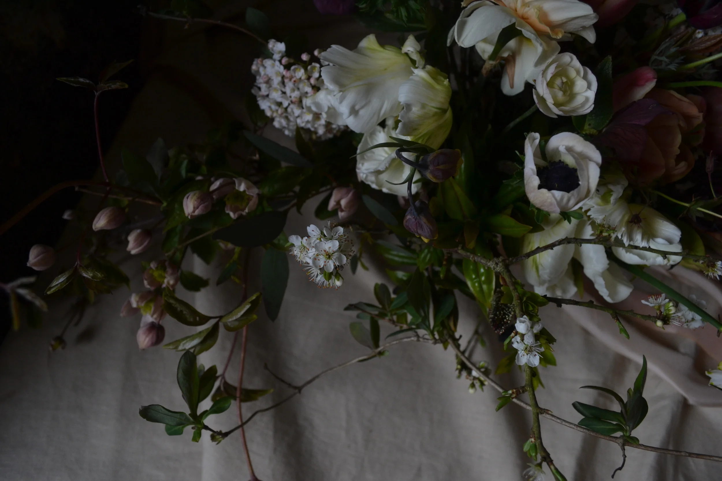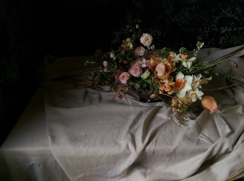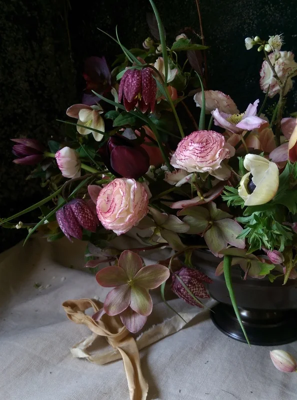 Taking the colour palette from the bouquet, those dusky peaches and rich maroons Maz created a beautiful compote arrangement.  Working in the last of the hellebores through the bowl which lend themselves in low arrangements like this one.   Fritillaries and now just the start of sweet rocket all create a beautiful movement and lightness to some of those larger face flowers.