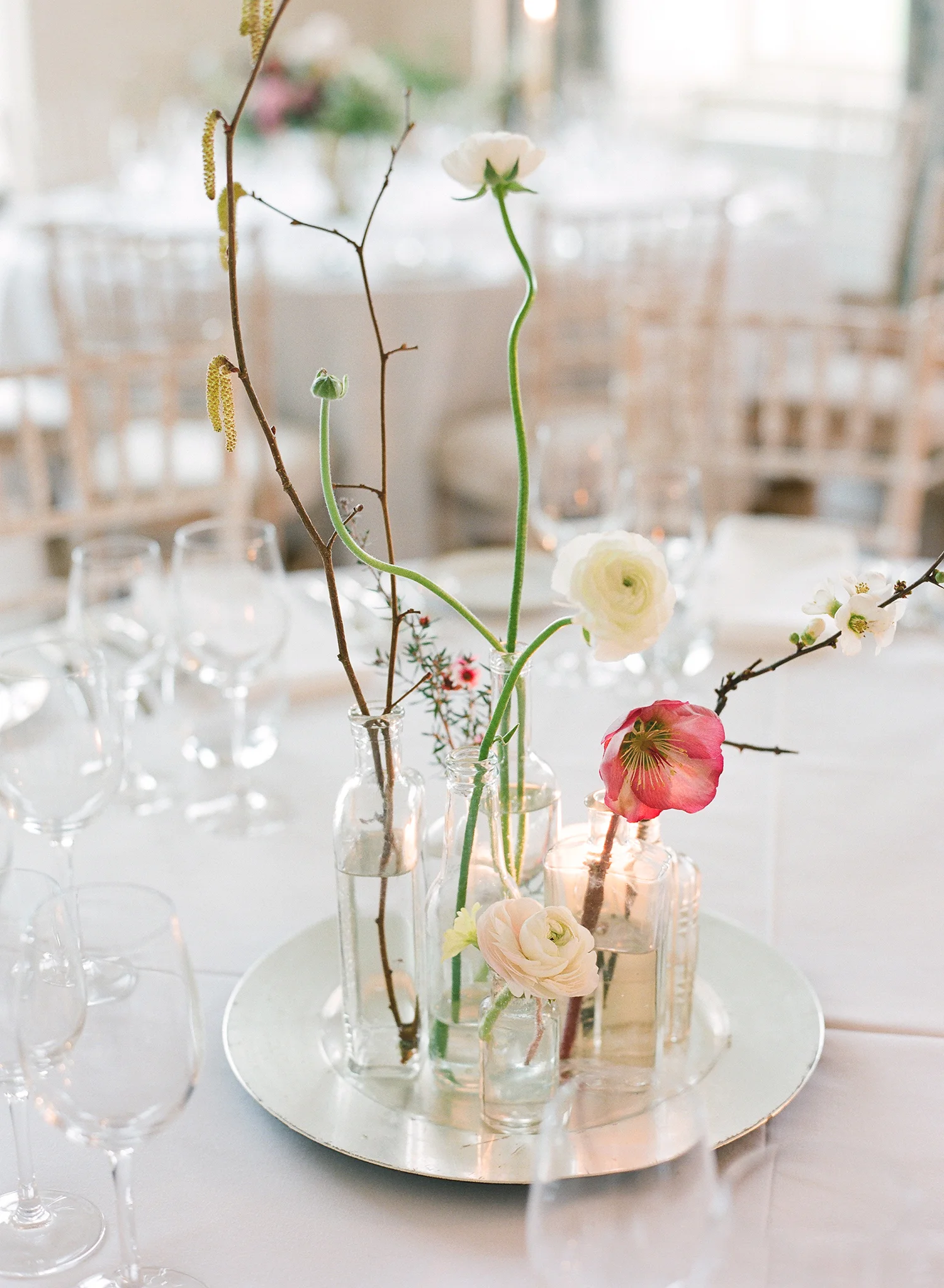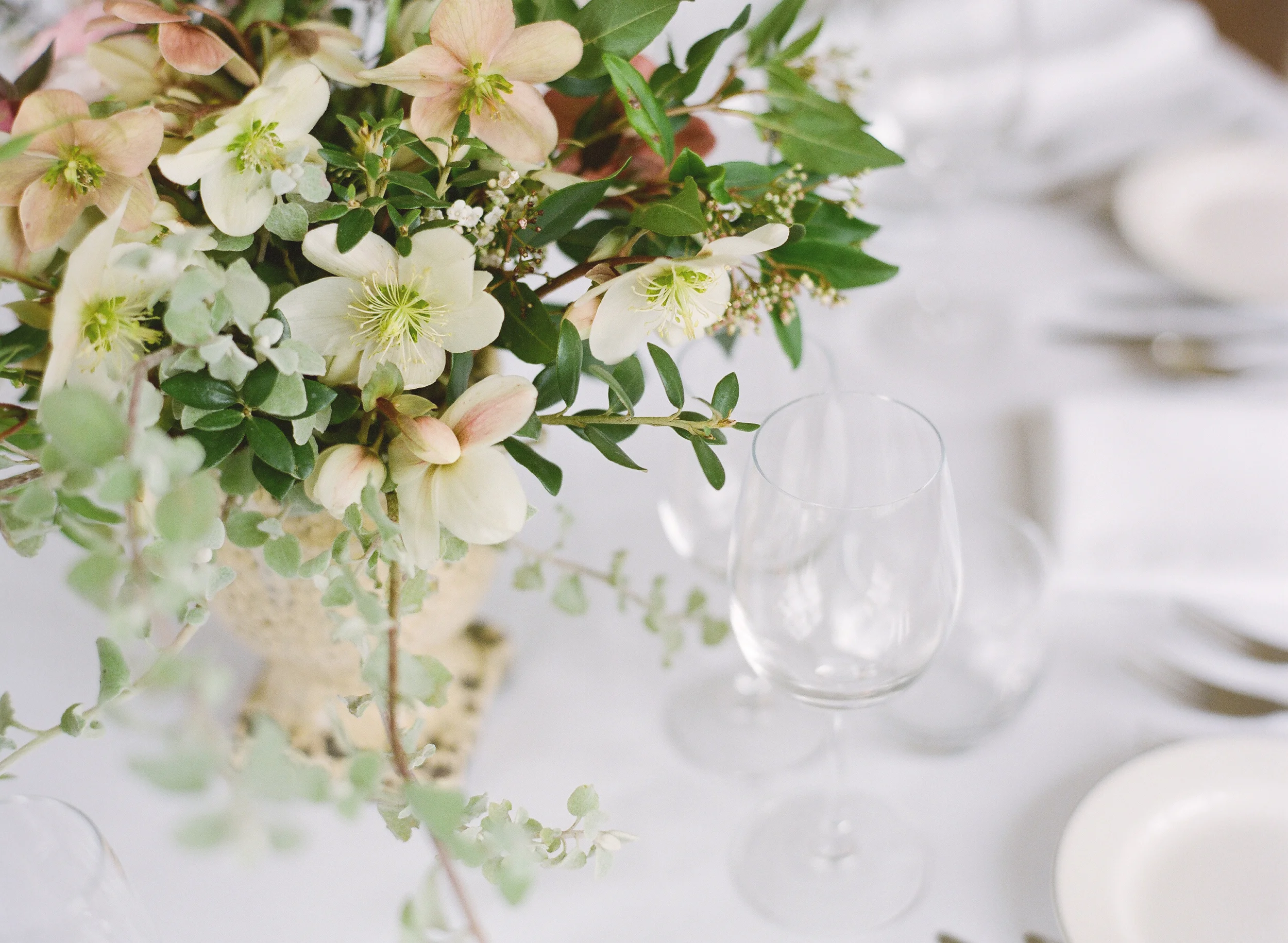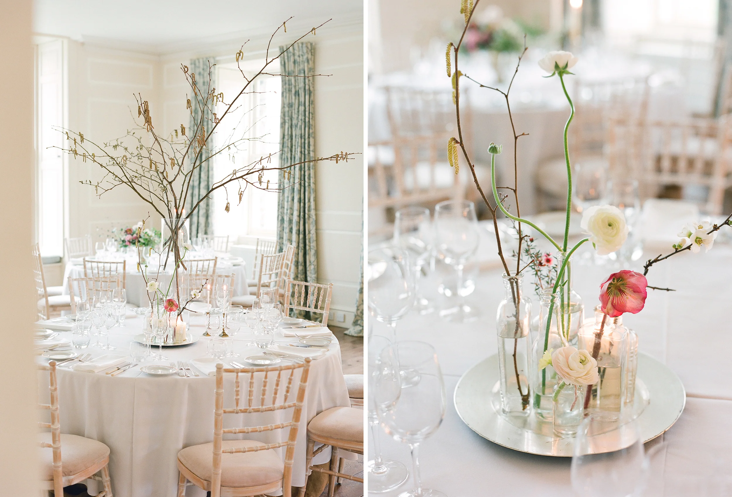 We created three different tables; which much to our surprise actually worked well all together in one room...  a new idea we may try and encourage more with our brides!  An elegant urn arrangement filled with scrumptious Hellebores, frilly rannunclus and flowing vines.  A table inspired by flowering branches and spring offerings, collected together with added height which in this table was filled with catkins, but once blossom season is upon us would be a beautiful feature.  Finally elegant white and green a firm favourite with our brides this year; clean and simple in cut glass vessels.